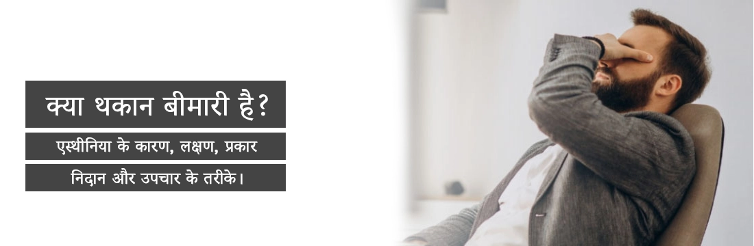एस्थीनिया या थकान कई कारणों से हो सकती है, थकान होना कोई बड़ी बात नहीं है लेकिन अगर यह थकान पूरे शरीर में हो और काफी समय से चलती आ रही हो तो यह चिंता की बात हो सकती है। इन स्थितियों आपको डॉक्टर से संपर्क करना चाहिए। लम्बे समय से थकान कई गंभीर कारणों से भी हो सकती है जिसका निदान करना आवश्यक हो जाता है, नज़दीकी डायग्नोस्टिक सेंटर से अपना निदान करवाएं और सटीक इलाज से इसके कारण को ठीक किया।