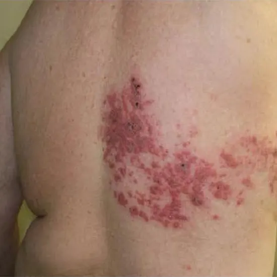 Herpes zoster disseminated is defined as more than 20 skin lesions occurring primarily outside the affected area or immediately adjacent dermatomes. Organs other than the skin can also be affected, causing hepatitis and encephalitis, a condition that can be fatal.