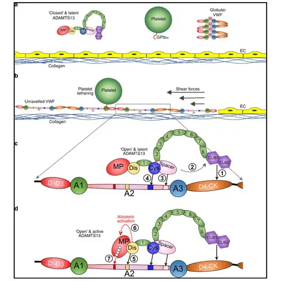 Von Willebrand factor (VWF) interacts with platelets and breaks down extremely large VWF multimers at the Tyr(1605)-Met(1606) bond in the A2 region of VWF under the control of a plasma protein known as ADAMTS13. Reduced or missing ADAMTS13 action can keep UL VWF in place because it can cause intravascular platelet buildup and microthrombi, which can cause clinical manifestations or arrows of thrombotic thrombocytopenic purpura.