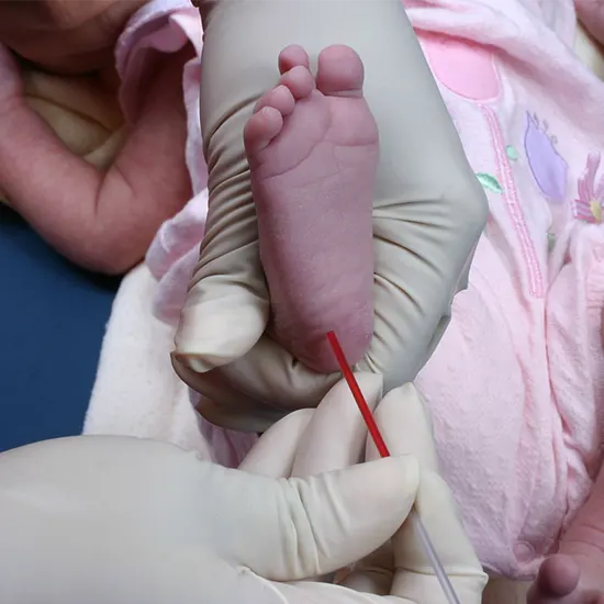 A blood sample is taken from an infant's capillaries as part of a diagnostic procedure called a capillary blood gas (CBG).
