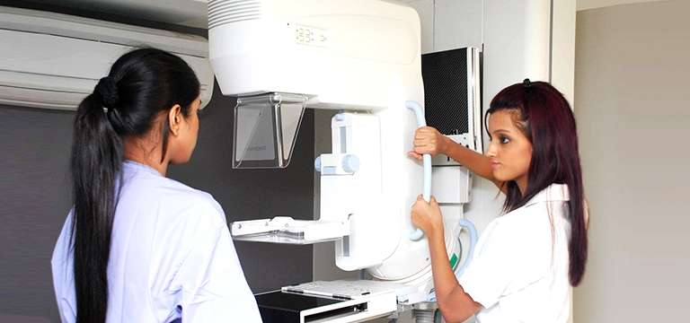 - Image acquisition: Once the breast is properly positioned and compressed, the technologist will step behind a protective shielded area and activate the mammography machine. During image acquisition, one will be asked to hold breath for a few seconds to minimize motion blur.