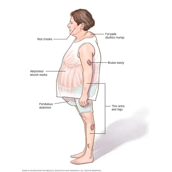Patients may grow weak, brittle skin that is prone to bruising. They might also have pink or purple stretch marks on their thighs, hips, and belly.