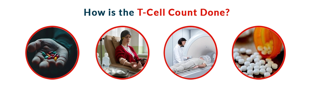 T-cell count is conducted through a routine blood test as a Complete Blood Count (CBC). T-cell, a lymphocyte type, helps fight infections. If its levels are in excess or reduced, they indicate active or undiagnosed disease presence.