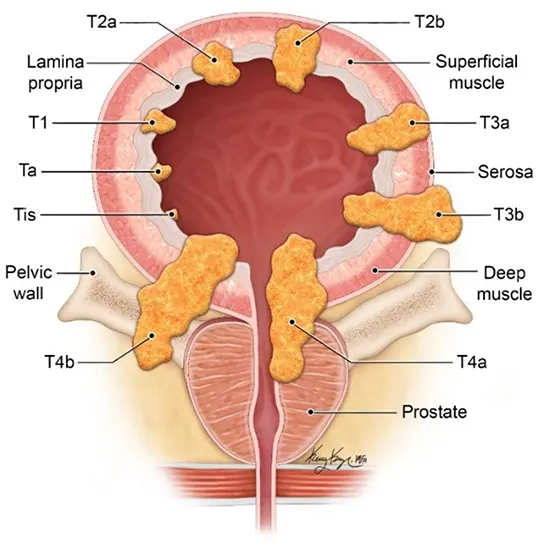 The stages of urinary bladder cancer are used to describe the extent and spread of the cancer within the bladder and to other parts of the body. The stages are determined by the size of the tumor, how deeply it has invaded the bladder wall, and whether it has spread to nearby or distant organs. The most commonly used staging system for bladder cancer is the TNM staging system, which stands for Tumor, Node, and Metastasis.