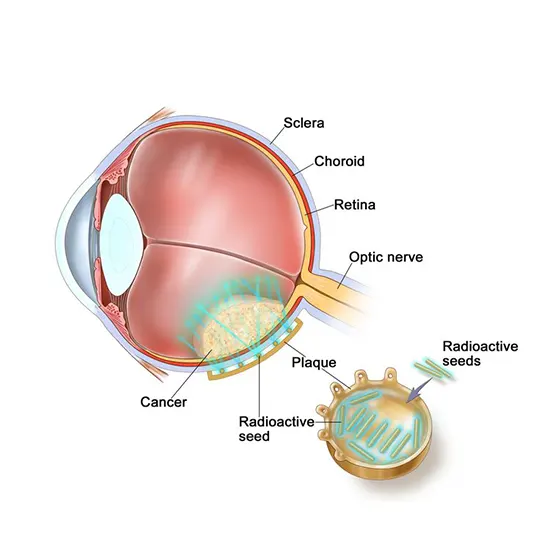 In brachytherapy, a tiny radioactive device (plaque) is positioned on the surface of the eye, close to the tumor. The plaque is then removed after the radiation has been administered over several days.