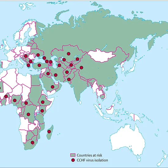 Africa, Asia, and parts of Europe are where CCHF is most prevalent. The virus has been discovered in numerous nations, including South Africa, Uganda, Zimbabwe, Afghanistan, Iran, Iraq, Pakistan, Tajikistan, Turkey, and Uzbekistan in Asia; Albania, Bulgaria, Kosovo, Romania, and Russia in Europe; and Afghanistan, Iran, Iraq, and Tajikistan in Asia.