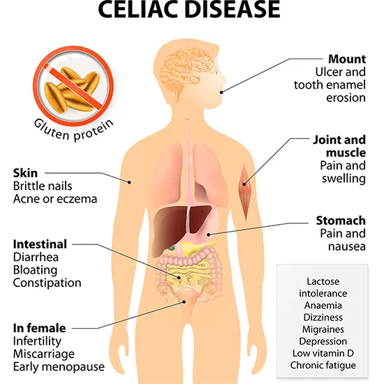 A celiac disease that causes problems in your digestive system when you consume gluten. Gluten is a protein that is usually found in wheat and other grains.