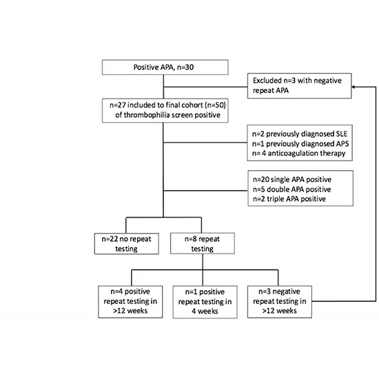 Antiphospholipid antibodies (aPL) are the most prevalent form of acquired thrombophilia. It is required to test positive for one or more of the three antibodies (lupus anticoagulant, anticardiolipin antibodies, and anti-2-glycoprotein I antibodies) twice, more than 12 weeks apart, for aPL.