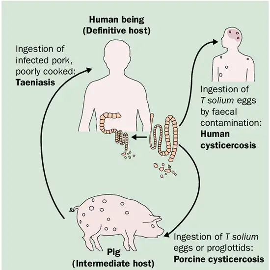 Taenia solium, a tapeworm, infects the patient and causes neurocysticercosis. By consuming microscopic T solium eggs in tainted food, water, or fomites, humans can contract cysticercosis. Tapeworm eggs in water or food move through the intestinal wall to several tissues, including the brain.