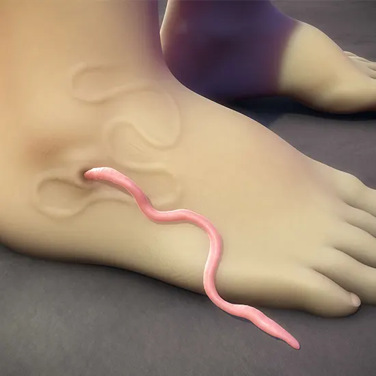 Dracunculiasis (Guinea worm disease) is a parasitic infection. It is caused by the nematode worm Dracunculus medinensis. It is a painful and disabling disease that affects the skin and underlying tissues, causing painful blisters or ulcers, typically in the legs or feet. Dracunculiasis is transmitted to humans through ingestion of water containing copepods, a type of small crustacean, that are infected with the larvae of the Guinea worm.