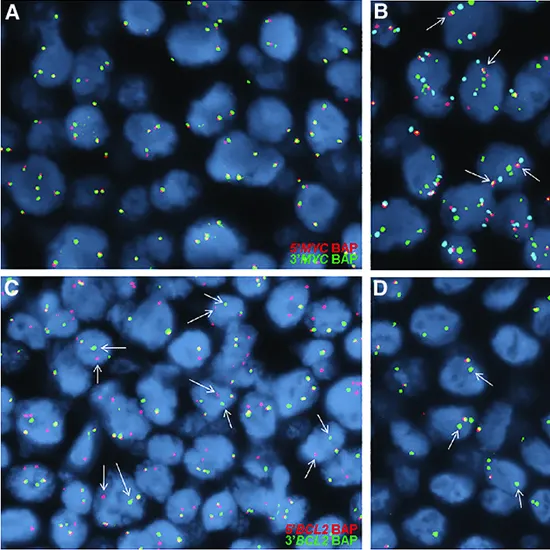 Rearrangement B-Non Hodgkin lymphomas can be identified and subclassified using the BCL6 gene fusion's presence. Moreover, BCL2 and MYC gene fusions can predict prognosis in B-cell lymphomas with characteristics halfway between DLBCL and Burkitt lymphoma.