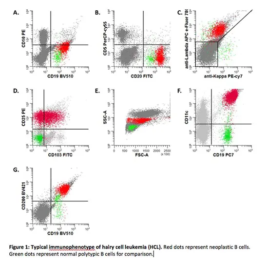 CD11c, CD19, CD20, CD22, CD25, CD45, CD103, kappa, and lambda are markers (9 markers). used to determine the presence of hairy cell leukemia and its variants. Bone marrow aspirate, peripheral blood, fresh bone marrow core biopsy, unfixed tissue, and bodily fluids can all be tested using flow cytometry.