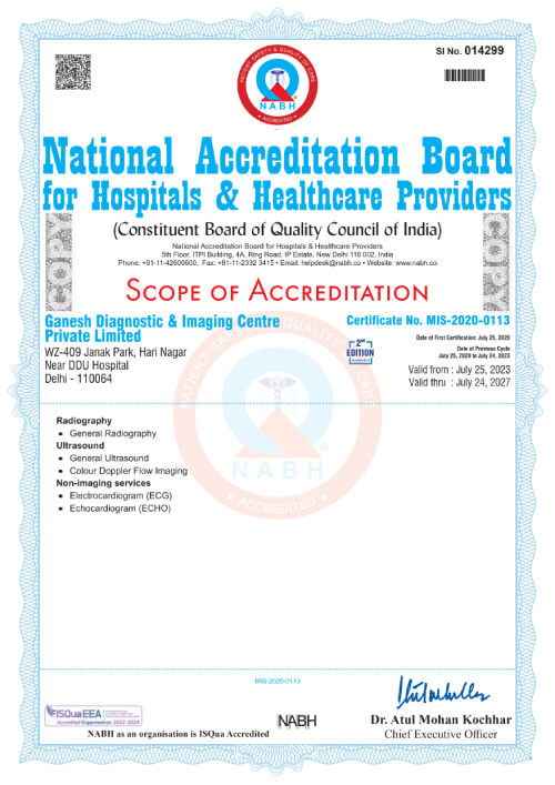 Ganesh Diagnostic and Imaging Centre is the well-famous National Accreditation Board for Hospitals & Healthcare Providers (NABH) accredited best diagnostic centre in Hari Nagar. located at Wz-409, Janak Park, Near D.D.U Hospital, Pocket 408, Hari Nagar, New Delhi, 110064. For decades, we are providing the best of the best diagnostic services comprehensively and seamlessly. We are providing our valuable services at various locations in Delhi, NCR. We are accredited with the highly prestigious NABH (National Accreditation Board for Hospitals & Healthcare Providers) and NABL (National Accreditation Board for Testing and Calibration Laboratories) certification for our world-class affordable services. We are maintaining our standard over decades with ethical practice and highly skilled doctors for diagnosis and patient care.