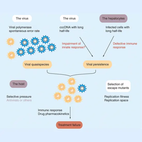 Signature mutations in the reverse transcriptase regions of the viral polymerase gene are present in drug-resistant strains of HBV (Table 1). Resistant mutations change how the medicine and HBV polymerase interact, interfering with the drug's ability to inhibit viral polymerase.