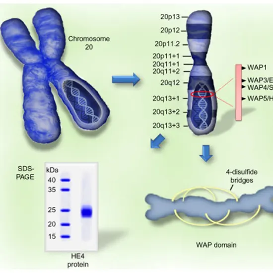 Human epididymis protein 4 (HE4) is a protein that is produced by epithelial ovarian cancer cells. The Human Epididymis Protein 4 Test monitors epithelial ovarian cancer which is one of the most common ovarian cancer types.