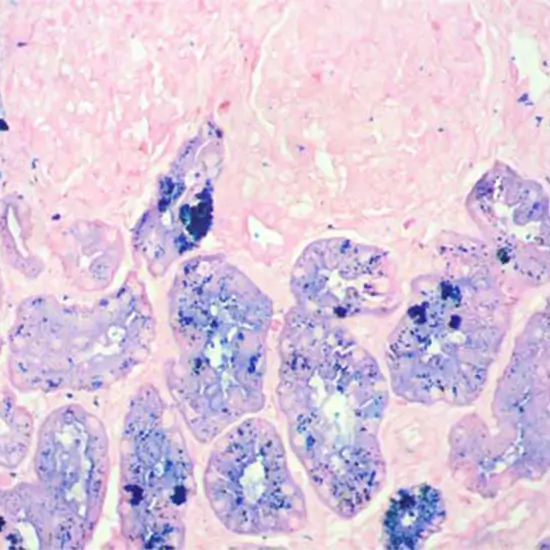 Hemosiderin is an iron storage complex. The iron in hemosiderin deposits is not readily available. Hemosiderin build-up is frequently found in epithelial cells of the liver and kidney. Several diseases create significant hemosiderin deposits in tissues, which can cause organ damage. Hemosiderin can build up in numerous organs in disorders.