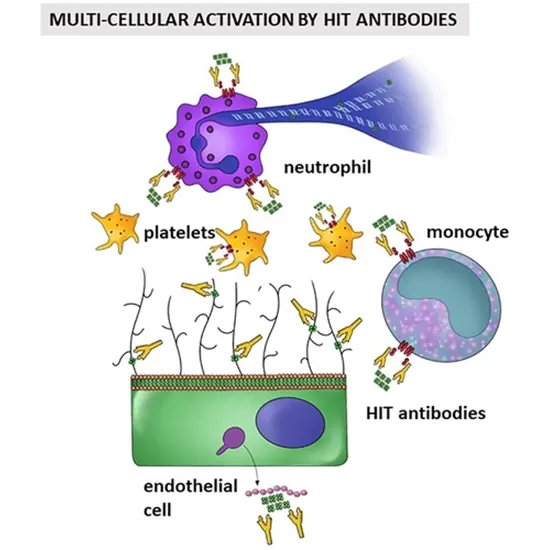 Heparin's interaction with the platelet protein PF4 causes HIT. A complex is created when heparin and PF4 are combined. Heparin-PF4 is the name of the complex's component elements (heparin and PF4). Your immune system produces antibodies in response to the presence of heparin-PF4. Heparin-PF4 is bound by these antibodies. Your platelets begin to coagulate as soon as the antibodies attach.