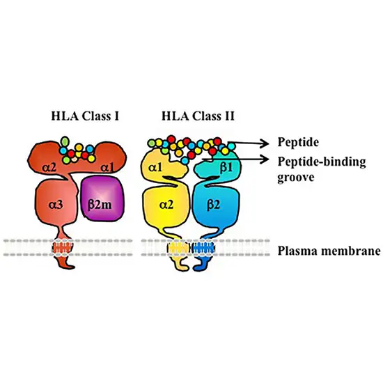 HLA- B7 is a polymorphic protein of the human MHC class. This is a type of surface protein that is a heterodimer consisting of a specific transmembrane HLA- B chain paired with beta microglobulin sulin.