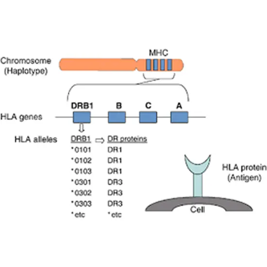 HLA typing is a method used to identify Human leukocyte antigen alleles. HLA genes are located at chromosome 6 and are responsible for regulating the immune system by differentiating the body’s own protein from the proteins formed by viruses and bacteria.