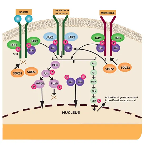 When the JAK2 protein is activated, it sends a message to the STAT protein, which then engages in a process known as dimerization to attach to another STAT molecule. After entering the cell's nucleus, this collection of chemicals activates genes that instruct the cell to divide and grow.