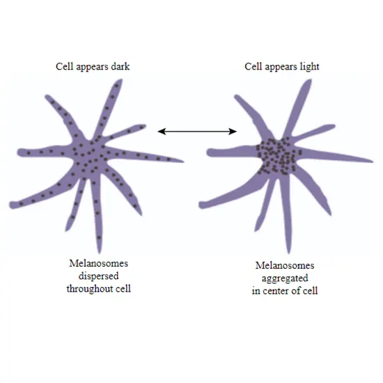Melanophores move their pigment in response to external signals, which in frogs and fish are hormonal stimuli and neurotransmitters, respectively. In both situations, melanosome dispersion is brought on by increased intracellular cAMP levels, whereas aggregation is brought on by decreased cAMP. Uncertainty surrounds the regulatory processes that take place after these second messengers.