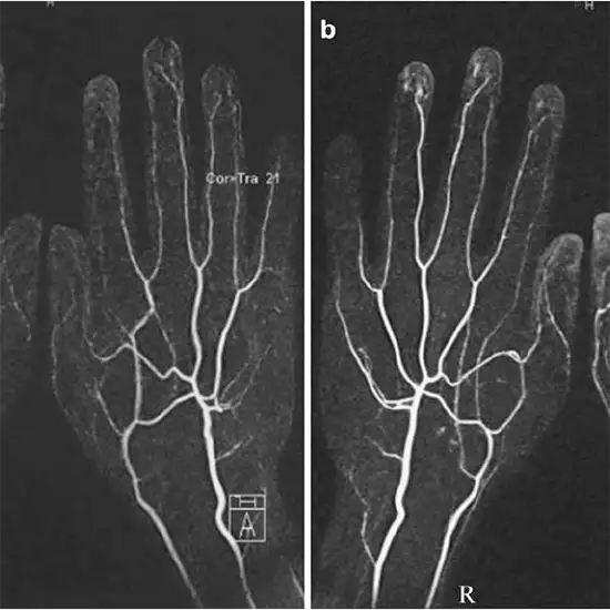 MRA(Magnetic resonance angiography) Right Hand is an imaging procedure that obtains high-resolution images of blood vessels of the right hand. This scan is used to evaluate bone viability and view scaphoid bone. It helps doctors in diagnosing various conditions such as aneurysms, emboli, tumors, and various other arteriovenous malformations.
