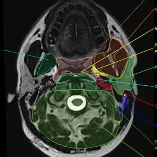 The MRI Face and Neck show the face and neck structures. It identifies diseases of soft tissue, blood vessels, or bone. MRI of the neck can detect spinal cord damage and tumours.