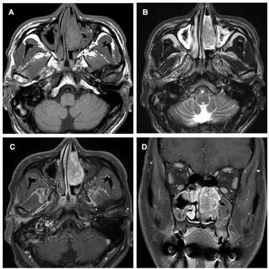 A contrast-enhanced MRI of the paranasal sinuses (PNS) produces an image of the four pairs of air-filled cavities surrounding the nasal cavity, pituitary gland, and soft tissues. The contrast facilitates the visibility of internal organs.