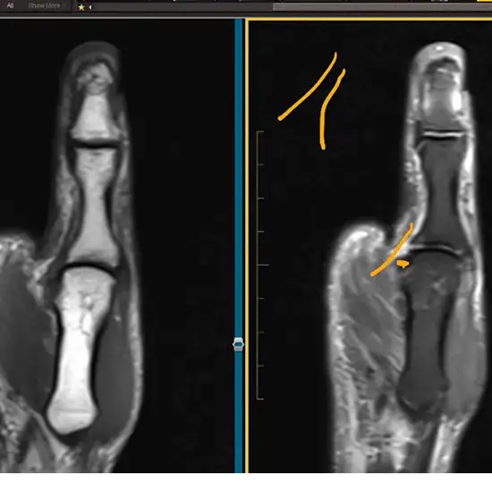 An MRI of the right thumb shows the bones of the thumb and the cartilage, tendons, ligaments, muscles, and blood vessels in the area.