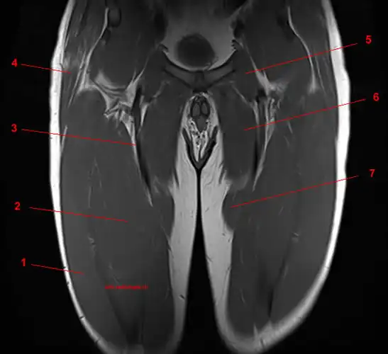 An MRI of the thigh shows the bone and surrounding cartilage, tendons, ligaments, muscles, and blood vessels. An MRI thigh scan diagnoses leg discomfort and a thigh fracture. This test detects abnormal thigh muscle or soft-tissue growth.