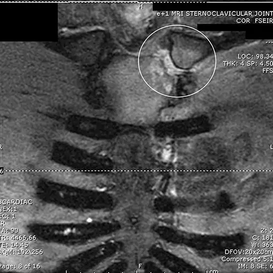 Magnetic resonance imaging (MRI) sternoclavicular joint examination is a non-ionizing technique that produces images of the joint located between the sternum and the clavicle.