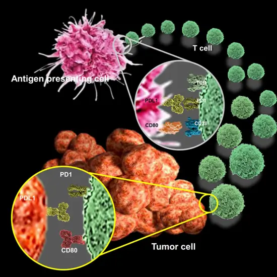 This test detects the presence of PDL1 on cancer cells. PDL1 is a protein that aids in the prevention of immune cells attacking non-harmful cells in the body. Normally, the immune system defends against foreign substances such as viruses and bacteria rather than your own healthy cells. PDL1 is abundant in some cancer cells. This allows cancer cells to "trick" the immune system into thinking they are foreign, harmful substances and thus avoid being attacked.