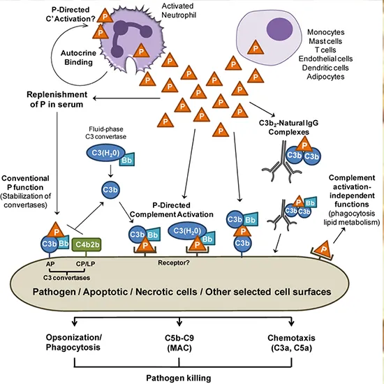 The CFP (complement factor properdin) gene in humans encodes the protein known as properdin. A plasma glycoprotein called properdin stimulates the innate immune system's complement system. To stabilize the C3 and C5-convertase enzyme complexes and create an assault complex that results in the lysis of the cell, this protein attaches to the cell walls of bacteria and dying human cells.