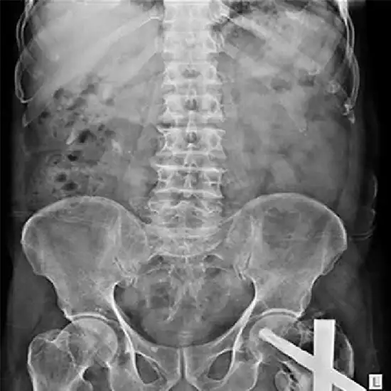When performing erect, situate the patient in the pa position. This has many benefits, including less radiation exposure to the gonadal region and better use of beam divergence. For patient stability, place the arms by the side or grasp the erect Bucky's handlebars. The Ferguson approach can be used to describe the weight-bearing pa view.