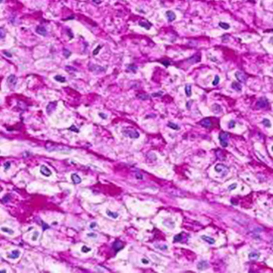 It is seen that periodic acid-Schiff (PAS) staining procedure could be considered most commonly being used in your histology laboratory to further detect your glycogen deposits in liver. This is where the glycogen storage disease could be suspected. Moreover, the Glycogen granules would be visible in the tumors of the following: