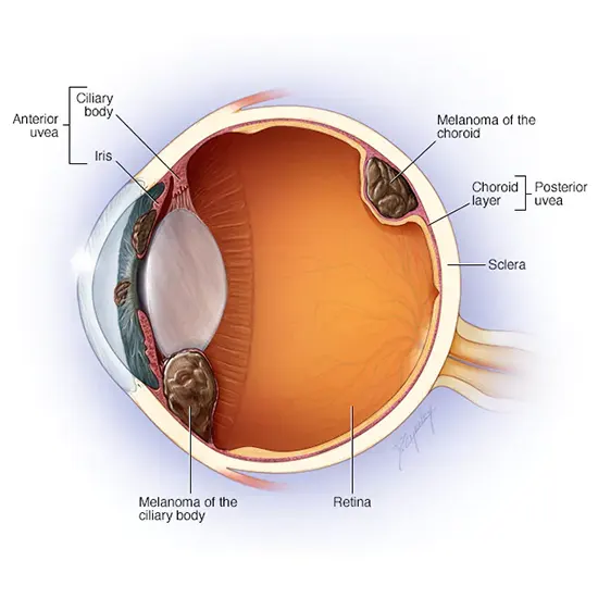 Uveal melanoma, also known as ocular melanoma, is a rare type of cancer that arises from the pigment-producing cells (melanocytes) in the uvea, which is the middle layer of the eye. The uvea includes the colored part of eye(iris), the ciliary body (which produces the fluid in the front of the eye), and the choroid (a layer of blood vessels that provides oxygen and nutrients to the retina).