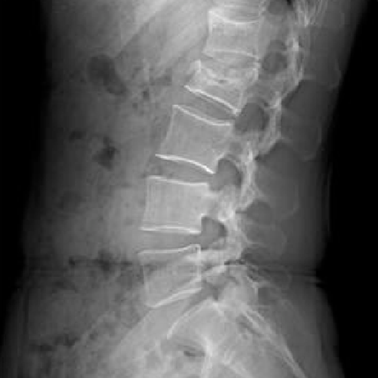 The lateral view is obtained from the side of the patient. It identifies persistent back pain, diseases, infections, slipped discs, tumors, osteoporosis, and osteoarthritis. It helps analyze birth defect-related aberrant spine curvature.