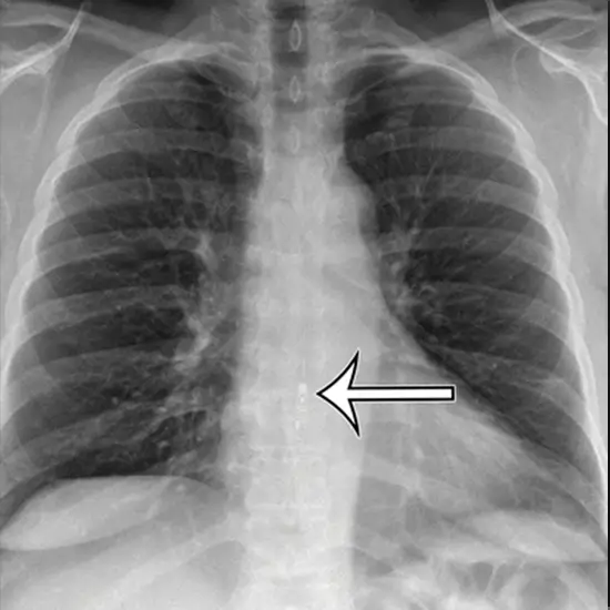 An X-ray of the Oesophageal Area A.P. (F. Body) identifies accidentally ingested external objects such as chicken or fish bones, buttons, marbles, screws, button batteries, and straight pins in children, as well as the location of swallowed fish bones, coins, fruit pits, straight pins, and dentures in adults, as well as a blockage caused by external objects in the upper gastrointestinal tract, which can lead to upper G.I. infections.