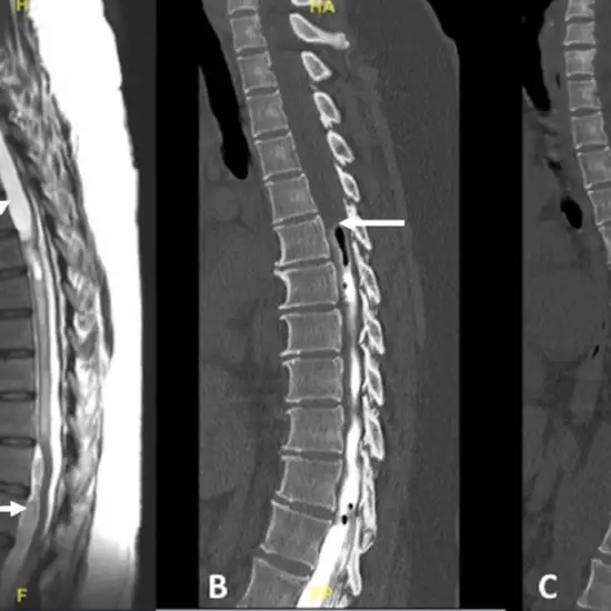 A myelogram is an imaging procedure that looks at the connection between your vertebrae and discs, as well as the spinal cord, nerves, and nerve roots. It determines whether something is actively pressing against your spinal cord, nerves, or nerve roots, causing back pain or numbness and weakness in your arms and/or legs. A radiologist will inject a contrast medium (also known as contrast material or dye) into your spinal canal through your lower back prior to the test. The radiologist may then take a few X-rays of your spine (a computed tomography (CT) scan of your spine after the injection will provide more detailed information.